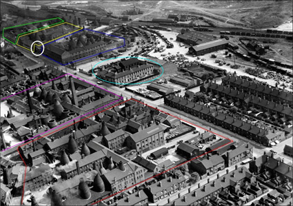 | Foley China Co (Red lines on photo below) | Wileman & Co later Shelley Potteries | The Foley China Late Foley Foley China |